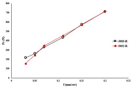 The analysis of the results, made it possible to observeforthetworecycledalloys,thatthecuttingforceFz increaseswhenthefeedchangesfrom0.03to0.2mm/rev. The cutting speed of 100 to 210 m/min shows almost no change. The ANOVA analysis in Table 3 showed that the cuttingforceFzcanbeevaluatedasafunctionofadvancefor recycled alloys 3003-R and 5052-R, and as a function of advance. Statistics R 2 explain 99.99 % variability in the cuttingforceFzofthetworecycledalloys3003-Rand5052R.Thereisthereforeaverystrongrelationshipbetweenthe advanceandthecuttingforceofrecycledalloys.