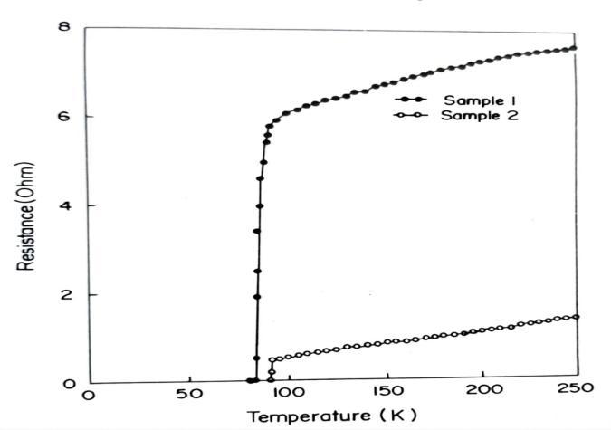 The high-Tc YBa2Cu3O7-x thin films studied in the experiment were deposited onto (100) SrTiO3 (10 x 10 mm2) substrate by dc magnetron sputtering technique [20].TargetwasstoichiometricYBa2Cu3O7-x.Substratewas gluedwithsilverpainttoaheaterblockandheatedto7007500C during deposition. The sputtering gas pressure was maintained at 800mTorr during deposition. Immediately after deposition pure dry oxygen was introduced in the chamber up to 300 Torr. The substrate temperature was slowly decreased up to 4750C and was kept at this temperature for one hour before removing the sample from the chamber. Thickness of samples was around 300 nm. The sample was patterned into a micro-bridge of dimension 50x50 m2 using standard photolithography followedbyetchinginsaturatedEDTAsolution.Inorderto investigate the influence of orientation on the low frequency voltage noise behavior of the YBCO thin films, voltagenoisewasmeasuredintwoYBCOthinfilmsamples of different phase and orientation. The samples were patternedintoamicro-bridgeof 50x50m2 dimension and low resistivity contacts were made on them. Prior to noise measurements, the electrical resistance and critical current density was measured using standard dc fourprobe technique [21]. Figure 1 shows the temperature dependenceofresistancemeasuredfortwoYBCOthinfilm samples. The resistance was found to decrease with decreasing temperature until superconducting transition is approached. Sample 1 has Tc (R=0) values of 83K whereas the sample 2 was having a higher Tc (R=0) value of 90.5K. The Jc in ambient field at 77K for sample 1 and sample 2 were 5x104 and 1.5x106A/cm2, respectively. The observed differences in the Tc and Jc values are attributed tothebettercrystallinequalityofsample2.