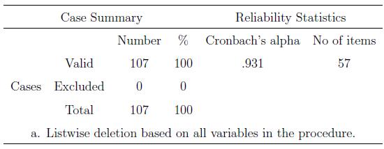 knownasCronbach'salpha test.Cronbach'salpha testisa valuable analysis used to assess the reliability or internal consistencyofanygivendatasetsStatisticsisusedtoassess thereliabilitytestofinteritemconsistency.Ahighervalue shows a strong relationship between the test items and a lowervalueshowsaweakerrelationshipbetweentestitems. Reliabilityisacceptableifthealphaiswithin.70and.99.If alphavalueisgreaterthan.70itmeansthedataisconsistent forfurtheranalysisInourcasestudy,Cronbach'salpha.931 isacquiredwhichverifytheconsistencyofdataachieved.It means according to this statement; result of reliability analysis data is reliable and further analysis can be proceeded.