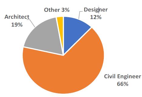 Fig 3. indicates that the major contribution was obtained fromthecivilengineers.Thedemographicresponserevealed thatmajorityofindividualsareprofessionalcivilengineers witharesponserateof66%and12%werefromdesigner, 19%fromarchitectand3%fromothers.