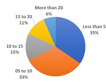 Theexperiencelevelplaysanimportantroleinenablingthe professionals.Plentyoftherespondentshadexperienceof building construction projects. Figure manifests that 35% respondentshaveanexperiencelessthan5years,33%have 05t010years,15%have10to15years,11%have15to20 years and 6% have an experience more than 20 years. respondentshaveanexperiencelessthan5years,33%have 05t010years,15%have10to15years,11%have15to20 yearsand6%