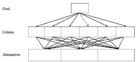 ThefirststepintheAHPistoconstructthedecisionproblem hierarchy.Thereisnospecificrulethatcanbefollowedto constructahierarchy.AHPenablesthecomplexdecisionto beorganizedintoahierarchyandisstructuredtoaddressthe complicatedproblemsatmultiplehierarchylevelswithatop priorityasgoalwhereasmediumlevelsarecriteriaandthe lowestlevelasalternative[73].