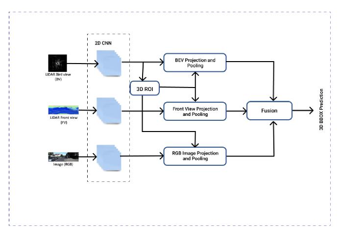 Before Chen et al. [3] created a network that takes the bird’seyeviewandfrontviewoftheLIDARpointcloudas well as an image as input. It first generates 3D object proposalsfromabird’seyeviewmapandprojectsthemto three views. A deep fusion network is used to combine region-wisefeaturesobtainedbyROIpoolingforeachview as shown in “Fig. 1”. Then the fused features are used to jointly predict object class and perform 3D bounding box regression. They proposed a multi-view sensory-fusion model for 3Dobject detection in the roadscene thattakes advantage of both LIDAR point cloud and images by generating 3D proposals and projecting them to multiple viewsforfeatureextraction.Aregionbasedfusionnetworkis introduced to deeply fuse multi-view information and do oriented 3D box regression. The approach significantly outperformsexistingLIDARbasedandimage-basedmethods on tasks of 3D localization and 3D detection on the KITTI benchmark [9]. Their 2D box results obtained from 3D detections also show competitive performance compared withthestate-of-the-art2Ddetectionmethods.Althoughthis methodachievesarecallof99.1%,itsspeedistooslowfor real-timeapplications