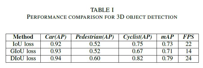 ThemodelshowedhighperformanceinNVIDIARTX2060 GPU.Theorientationofthe3Dobjectswasalsosuccessfully determined. The comparison of the performance under differentrotatedIoUlossesislistedinTableI.Also,in“Fig.7” showsthemodel’spredictionontestdatawherethemodel candetecthighlyoccludedobjectstothecameraimage.