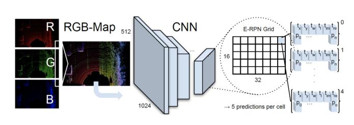 The complex-YOLO model by Simon et al, which uses a simplified YOLOv2 [16] CNN architecture which has 18 convolutional and 5 max pool layers, as well as 3 intermediatelayersforfeaturereorganizationrespectively, extendedbyacomplexangleregressionandE-RPN,todetect accuratemulticlassoriented3Dobjectswhilestilloperating inreal-time.The3Dpointclouddata,whichcancoveravery large area is confined to a smaller area 80m x 40m to generatebird’seyeviewRGBmap.TheRchannelrefersto Height,GchannelstoIntensityandBchanneltoDensityof the point data, the size of the grid map used is 1024x512 resolution and a constant height of 3m for all the objects. CalibrationdataobtainedfromtheKITTIdataset[9]isused toencodethepointsto the respective gridcell oftheRGB map.Themaximumheight,intensityanddensityofpointsin eachgridcellisencodedtothatgridcellwhichresultsinan imagethatencodesthepointcloudinformation.