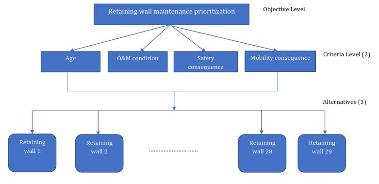 Thedecisionofwhichwalltomaintainataparticularpointin timeisbasedontheprioritizationrankingindexofthewall. Thisindexshouldreflecttherelativeimportanceofthewall, and why if required should be selected ahead of another. Therefore,thefactorsthathavegoneintothecomputationof this ranking should represent those that individually hold majorimportance.Whilethereareseveralprobablefactors thatcontributeinvaryingdegrees,itisimpracticaltoinclude all of it in the hierarchical process. Thus, key criteria that werefoundthroughliteraturereviewhavebeenshortlisted. TheNCHRPReport903whichprovidesanimplementation guidance for transportation agencies implementing geotechnical asset management (GAM) developed a GAM planner tool. These factors which were retaining wall age, O&M condition, mobility consequence, and safety consequence correlated with the variables in the asset inventoryoftheGAMplannertool.