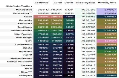 Recovery Rate is calculated by 100* (number of recoveries in a state/number of confirmed cases in a state)