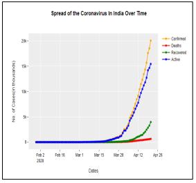 IntheFigure1,theXaxisshowstheDatesonaninterval of 15 Days and Y axis shows the number of cases (in thousands).Orange line shows “Confirmed cases” (positive cases), Red line represents “Deaths” cases which showing the number of cases who had lost their lives, Green line represents “Recovered” cases which depicts the count of people who has recovered and the Blue line represents “Active” cases, the difference of DeathsandRecoveredfromConfirmedcases.