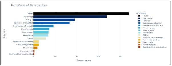 ThebargraphinFig.5X-axisshowsthepercentagesand Y-axis shows the name of symptoms which has been analyzedfromthepeoplewhohasbeentestedtillnowin India. This is the observation to keep the average symptomschecklistthathasbeencreatedtokeepalead if some new patients comes and can be helpful in classifyingthemaspositiveandnegative