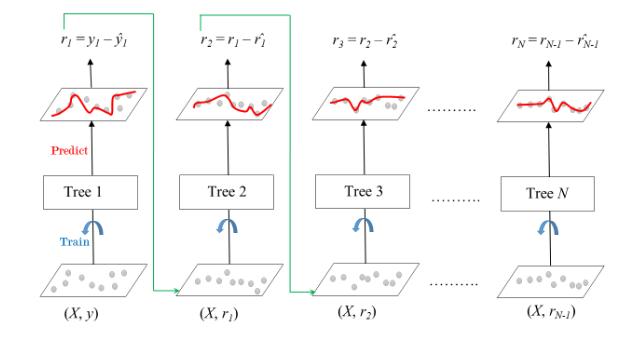 The ensemble consists of N trees. The matrix X and labels Y are first used as training parameters for the first Tree. The residual errors r1 are determined using the labeled classifications y1. Then, Tree2 is trained with the r1 and X from Tree1 , and so on. Using the predicted outcomes r1, the residual r2 is determined. This goes on untileverytreepresentisfullytrained.