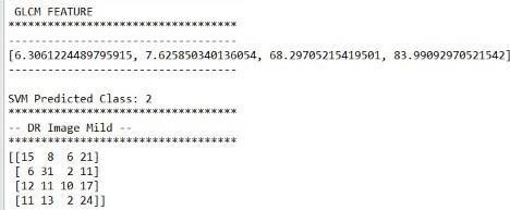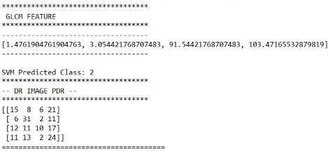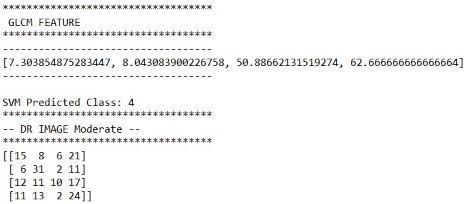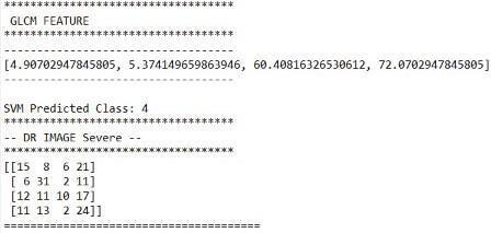 Inordertoshowthegeneralizationabilityoftheproposedsystem,weevaluatedtheperformanceoftheproposedsystemusing the fundus images datasetthatisprovided byLVPEI hospital, which consistsof several diabetic retinopathies affected retinal images aboutof 250 images, that is adequate for the GLCM based model. The feature extraction starts from an initial set of measureddataandbuildsderivedvalues(features)intendedtobeinformativeand non-redundant,facilitatingthesubsequent learning and generalization steps, and in some cases leading to better human interpretations. The Categorical classifier is trainedusingfeaturesextractedfromtheretinalimagesdatatrainingsetandtestedonone-fourthoftheretinalimagesdataset. Asimplefunctioniscreated,ittakesthefilenameoftheimage(alongwithpath)asinputandloaditusingloadimagemethodof imagescalingandresizetheimageas250X250withthehelpofmatplotlibplotit,convertitintoarastergraphicsimagewith nolossofquality,anewimagewithahigherorlowernumberofpixelsmustbegenerated,whichwepassasaninputtopredict methodofthemodelobject.Thesegmentedregionsareconsideredforthepredictionofdiabeticretinopathyfeatureextraction andclassificationoftheimage,consideringtheGLCMfeaturesvaluesthatarestoredinpicklefile.