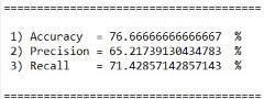 TheAccuracyofatestisitsabilitytodifferentiatethepatientandhealthycasescorrectly.Toestimatetheaccuracyofatest,we shouldcalculatetheproportionoftruepositiveandtruenegativeinallevaluatedcases.Mathematically,thiscanbestatedas: Accuracy =(TruePositives+TrueNegatives)/(Truepositives+TrueNegatives+FalsePositives+FalseNegatives)Themodel gaveusanoverallaccuracyof76.67%,precisionvalueof65.21%,andRecallvalueof71.43%.