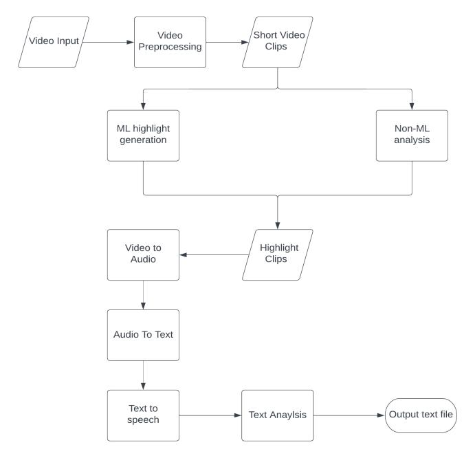 Ourproposedsystemtakestheinputoftherawvideofileof thegamewhichusuallylastsninetyminutesplusinjurytime, toimproveperformancewecandividetheinputfileintotwo halvesofthegame.Thesystemwillthenextracthighlights from the competition by usingmachinelearningand nonmachinelearningalgorithms.Theoutputhereisahighlight orimportantmomentsthathappenedinthegamethiswill remove the time when the game is slow and nothing important is happening. After that, we remove the video fromthehighlightssothatwenowonlyhavetheaudioofthe wholegame.Thus,whentheaudiofileisconvertedtoatext file using speech-to-text models will generate a match summaryofallthecrucialbitsandhowithappenedfroma professional commentator. This is the final output of the wholeproposedsystem.