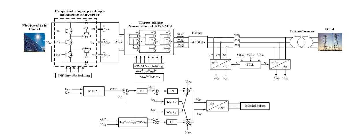 The proposed grid-connected solar Photovoltaic System with avoltage balancing converter is shown in Fig. 1. It consists of a PV array, a proposed step up converter for stabilisingthevoltageofthecapacitors,a3-phasesevenlevel Neutral Point ClampedMLI with its controllers, an LC filter to reduce total harmonic distortion, a grid interfacetransformerandapowergrid.