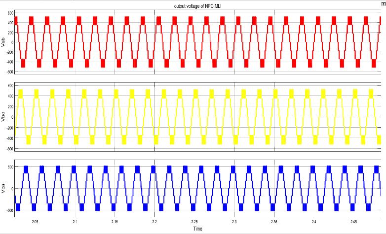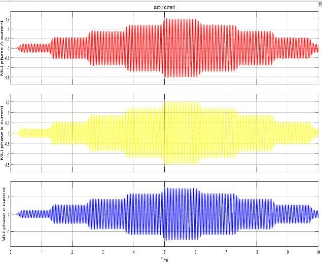 Fig.8-19displaysthesimulationstudy'sresultsinterms of responses. The balanced output of the three phase NPC-MLI in Figure 8 serves as a demonstration of the developed converter's ability to balance voltage. The diagram shows where each phase voltage has three levels in each of the positive and negative half-cycles, plusonezerolevel,foratotalofsevenlevels. Thephase currents ofa,bandc Phases oftheMLIhasbeen shown inFig.9
