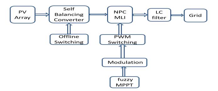 NPCmultilevel inverter topology solar photovoltaicsystemwithfuzzyMaximumpower point tracking being suggested, along with a step-up switching capacitor voltage balancing converter.Byutilizingtheappropriateswitching states, this suggested converter is capable of successfully equalize the DC link capacitor's voltage.