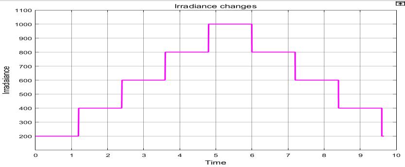 • The irradiations are varied as follows - 200 W/m2(0<t<1.2s),400W/m2(1.2s<t<2.4s),600 W/m2 (2.4s<t<3.6s) ,800 W/m2 (3.6s< t<4.8), 1000W/m2(4.8s<t<6s),800W/m2(6s<t<7.2s) ,600 W/m2 (7.2s<t< 8.4s) ,400 W/m2 (8.4s<t<9.6s),200W/m2(9.6s<t<10s)
