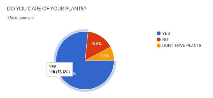 On asking whether they take care of plants or not 76.6% said they do take care of plants. 15.6% said they donāt take care of plants. 7.8% said that they donāthaveplants. ļ¬