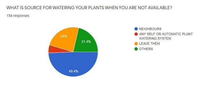 On asking what is the source for watering plants when they are not available 49.4% said neighbours, 5.2% said any selfwatering or autowatering system, 24% said that they leave them like that, 21.4% said others. ļ¬