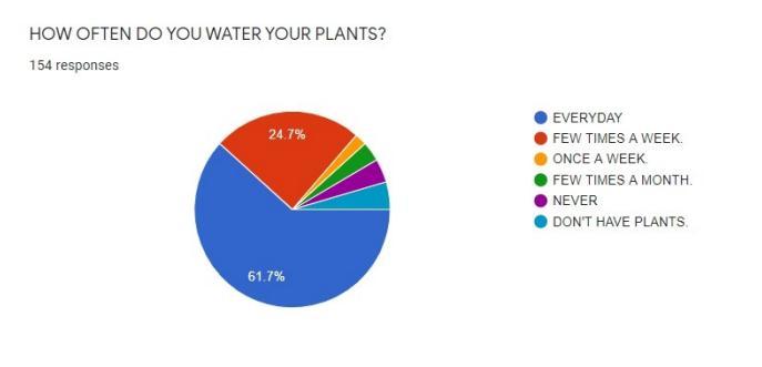On asking how often they water their plants 61.7% saidtheywatereveryday.24.7%saidtheywaterfew times a week. 1.9% said they water once a week. 3.2% said they water few times a month. 3.9% said theywaternever.4.5%saidtheydonāthaveplants. ļ¬