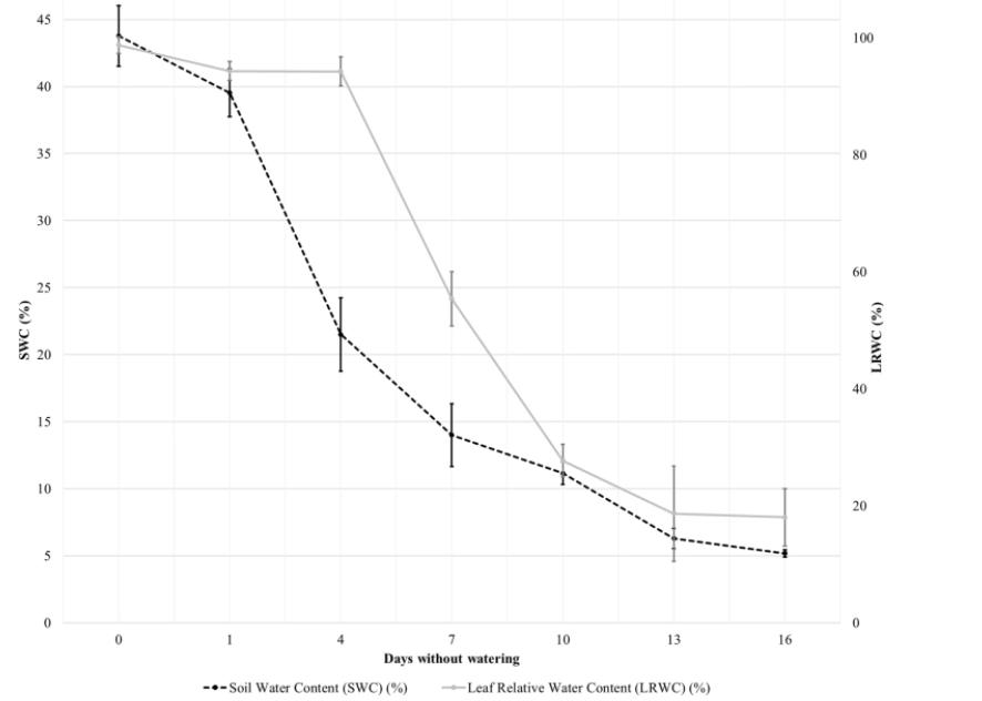 The above graph shows soil water content and leaf water contentfordifferentdaysofnotwateringtheplant.