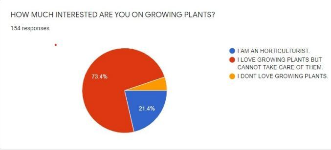On asking how much people are interested in growing plants 21.4% of people said they are horticulturists. 73.4% of people said they love growingplantsbutcannottakecareofthem.5.2%of peoplesaidtheyarenotinterestedingrowingplants.