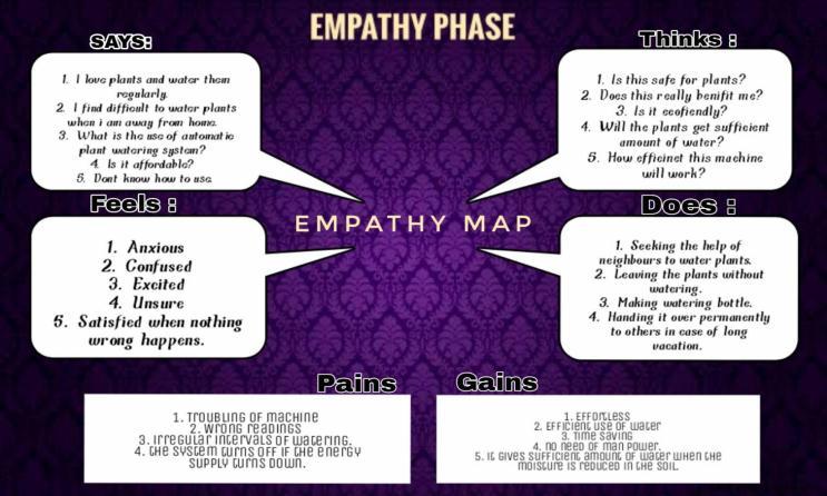After completing the primary research by analyzing and observingthedatafromprimaryresearchwedesignedan empathy maptovisualizethedata inmoresimplifiedand creative way by dividing the sheet into 6 sections or quadrants.Those6quadrantsare ļ¬ Says-Whattheusersaysinaninterview ļ¬ Thinks-Whattheuserthinksduringtheinterview. ļ¬ Does-Actionsdonebytheuseraccordingtothe research. ļ¬ Feels-Theemotionalstateoftheuserwhile responding. ļ¬ Pains-Disadvantagesfortheuser. ļ¬ Gains-Advantages.