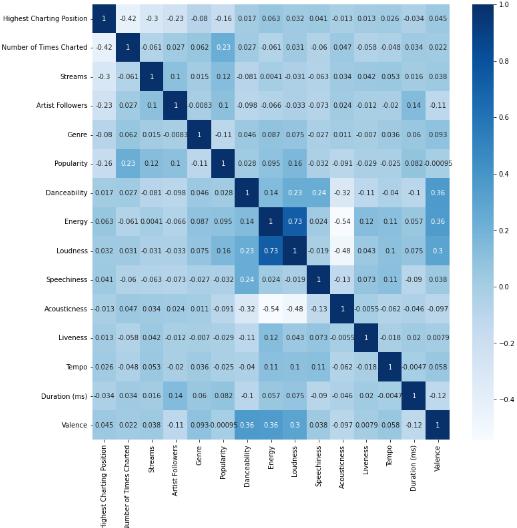 Figure6showsaheatmapofthedatawhichwehaveusedto achieve our results. Heatmap map is defined as graphical notationoflargevolumeofdatacodedbydifferentcolours. Theheatmaptakesallthevariablespresentandcorrelates them with each other at the same time. Figure 7 shows a histogramofnumberoftimesa songwaschartedvs Song Name,figure8isabarchartplottingofanartistvsstreams andfigure9isbarchartreflectionofgenreandstreams.