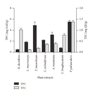 Total Phenolic and Flavonoid Contents.: Figure 1 displaysthephenolicandflavonoidcontentsofavarietyof medicinal plants. P. penduncularis and T. mauritianum extractshadthegreatesttotalphenoliccontent(5.570.22 mgGAE/gand4.920.55mgGAE/g,respectively).Extractsof C. bougheyanum and H. decumbens, on the other hand, showedthelowestTPC(0.790.06mgGAE/gand0.480.05 mgGAE/g,respectively).TFCwasgreatestforL.macrocarpa (0.110.01mgQE/g)andlowestforP.peducularis(1.380.06 mgQE/g).SimilartotheA.mannianaextract(0.390.04mg QE/g),theTFCoftheC.stelluliferumextractwasalso0.36 0.02mgQE/g.