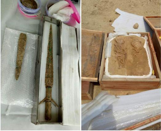 More than a hundred burials from the site were discoveredin2005–2006duringanexcavationledbyD.V. Sharma, ASI (Archaeological Survey of India), which Sharma connected to the Harappan (Indus) Valley Civilization. [6] It is more likely to be related to the Late Happen or Post-Harappan periods. [6] [9] [7] ASI uncovered several bowls/vases, gold bracelets, bangles, necklaces, containers, glass, terracotta sculptures, and many other objects alongside the tombs. [8] It is known that the two antenna swords, one of which has a copper sheath,resembletheLateHarappancopperhoard.