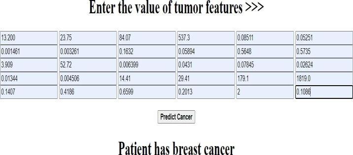 The web application for prediction of breast cancer is created.Theuserneedtoenterthevaluesofthe30Features asincludedinthedatasetextractedfromWisconsinbreast cancerrepository.