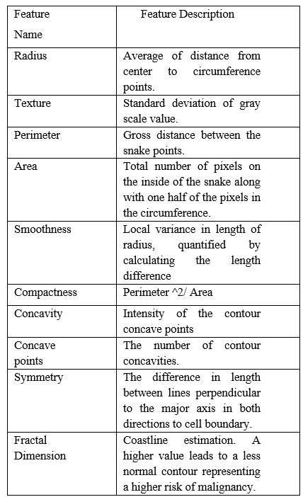 These features represent the shape and size of the target cancer cell nucleus.The sample of cells is collected from a breastthroughFineNeedleAspiration(FNA)procedurein biopsy test. For each cell nucleus, these features are determinedbyanalyzingunderamicroscopeinapathology laboratory.All values of the features are stored up to four significantdigits.Therewerenonullentriesinthedataset. The10real-valuefeaturesaredescribedintheTable1.