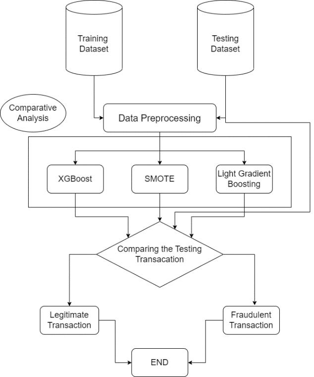 Asperthereferenceofthe[6]and[15],Ourproposemodel use Light Gradient Boosting Machine Learning (LGBM) as per the [6] and [15] perform far better than the other algorithms.OursystemcomparestheXGBoosting,SMOTE, Light Gradient Boosting and finds the transactions are legitimateorfraudulentasshowninfigure.