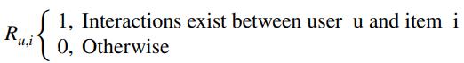 For recommendations, the aim is to obtain explicit and implicit feedback from the target user. Explicit feedback includes rating predictions, which correctly reflect the preferences of the items that users interact with. With regard to implicit feedback, we only know whether interactions exist between users and items. Existing interactions are regarded as positive feedback, whereas othersareregardedasnegativefeedback.Suchfeedbackis implicit because positive feedback does not indicate that users like the items. Moreover, the absence of interaction betweenusersanditemsdoesnotindicatethattheusersdo not like the items; rather, these could be disliked or potentiallypreferreditems.ThefeedbackRcanbeexpressed asfollows: (4)