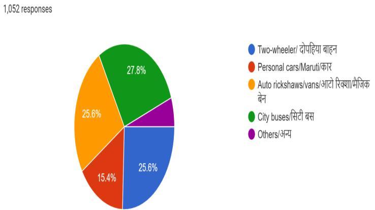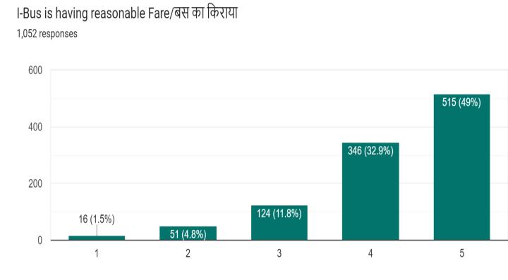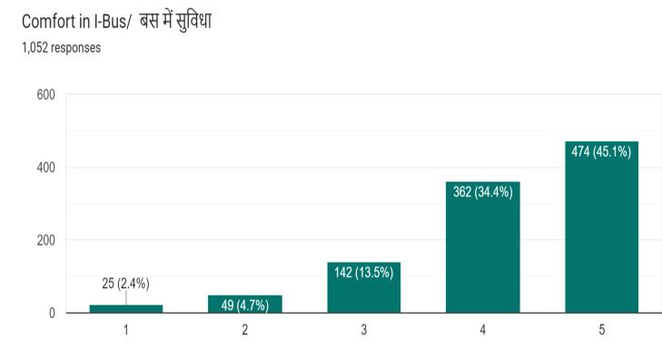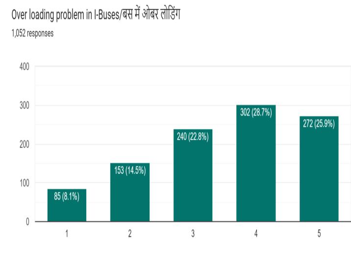 The responses from the user satisfaction google forms (Fig.16) also showed that approximately 25.6% of passengers from the sample will prefer to travel by twowheeler and 15.4% will use cars or four-wheelers if not usingI-bus.Accordingtothisdataoutof1052passengers, approximately270peoplemaytaketwo-wheelersand162 peoplemaypreferfourwheelerswhichoninterpolatingfor dailyridershipof44428gives11403people(2-wheeler)and 6842(4-wheeler) for a full day i.e. 760 two-wheelers per hourand456fourwheelersperhour.ThePCUconversionof thesetwoshowsthattherewillbeanincrementof570(PCU by2-wheelerperhour)andof456(PCUby4-wheelerper hour) if people will not prefer to travel by mass transit system.