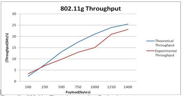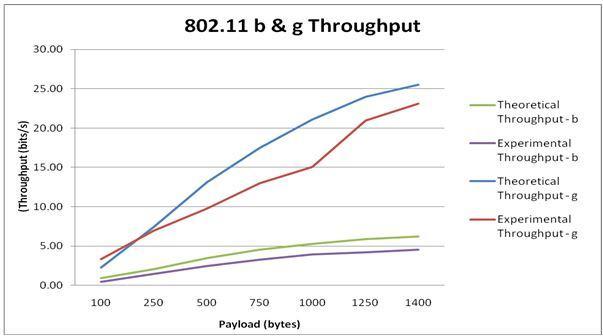 While table 1 showed the comparative values of both theoretical and experimental throughput associated with 802.11b, Table2 showed the comparative values of both theoreticalandexperimentalvaluesof802.11g. Figure 1a showed how theoretical throughput is higher than the experimentalthroughputin802.11bwhereasin802.11g,the experimental throughput appeared higher in much lower payloadbutassoonasthepayloadstartedincreasing,the experimental throughput maintained the dominance over theexperimentalthroughputasin Figure 2a.Thebroader picturedwasshownin Figure 3 thatdepictedthegeneral overview, comparing both the 802.11b and 802.11g such thatthe802.11gwaspictoriallyshowntobemuchhigher than the 802.11b in both theoretical and experimental scenarios.