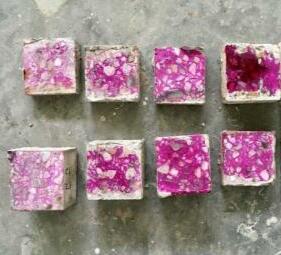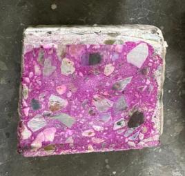 Aftercuringofcubes,itwasexposedtoairforsomeduration andthencutintotwopiecesforapplyingofphenolphthalein solutionoveritthenleftfor1hour±10minutes.Thepieces appeared to purple color after applying solution which indicating non-carbonated region as the colorless region indicatescarbonatedzone.Colorless region was measured withverniercalipertocheckthedepthofcarbon.Table6.8 andfigure67representtheresultofCarbonationdepth.In following reaction (3), which is known as carbonation, calciumhydroxideandcarbondioxidecombinetogenerate insolublecalciumcarbonate(CaCO3),whichcausesconcrete to carbonate and result in a lower pH value. According to Pasupathy[12]thedurabilityperformanceofthegeopolymer containing70%flyashand30%GGBFSwascomparableto OPCconcrete.