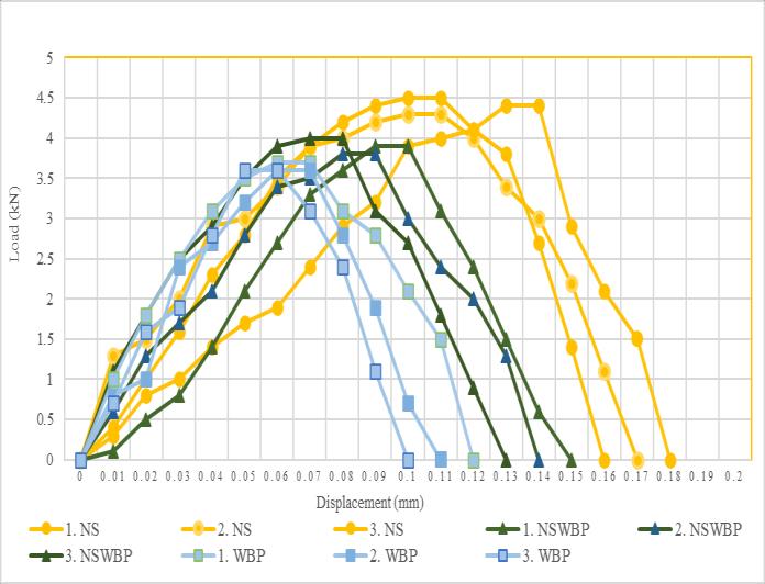 Based on the load displacement curve of NS which shows maximumloadupto4.4kN,forNSWBPitwas3.9kNandfor fullyreplacedwastebrickpowderitwas3.7kN.