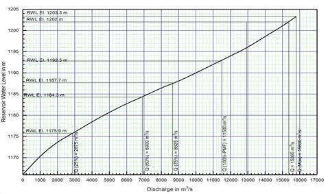 2.Dischargesof15,800m3/s(PMF+GLOF),15,365m3/s and11,500m3/scould be passedthroughall sixspans at RWL El. 1203.3 m, FRL El. 1202 m and RWL El. 1192.8 m respectively. Considering the free board above FRL, dischargingcapacityofthespillwayisadequate.