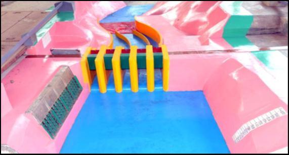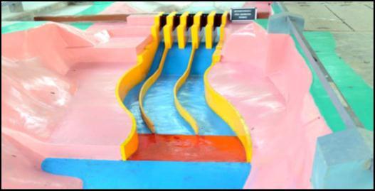 A model need not be made of the same materials as the prototype.Ifsurfaceoverwhichwaterflowsarereproduced inshapeandtheroughnessofthesurfaceisapproximatelyto scale(infactsmootherinthemodelthancorrespondingto prototyperoughness),themodelwillusuallybesatisfactory. Generally,theriverbedismadeupofsmoothcementplaster, spillway, non-overflow section of the dam etc. in masonry withneatplaster,spillwaypiersinteakwood,radialgatesin sheetmetalandoutletsarefabricatedintransparentPerspex. Closetolerances,particularlyincriticalareassuchasspillway crests, tangent points, energy dissipating appurtenances, modeldimensionsetc.areessential.Greatestaccuracyshould bemaintainedwheretherewillberapidchangesindirection offlowandveryhighvelocitiesoccur.Theprofilesofspillway and their allied structuresare finished to their final shape with the help of metallic templates fixed in alignment and elevation.Piezometersaregenerallyweldedtothetemplates so that their alignments are secured. The finishing of piezometersinmodelshouldbedonemeticulouslytoprevent measurement errors that would result from improper installation. Complicated curves for bell mouths of sluice spillway, breast walls, bends and transitions can be made fromPerspexwhichhasbeenheatedinovenandreshapedby pressingbetweenthemaleandfemaleconcretemolds.Itis notpossibletoreproducetheentirereservoirupstreamof spillwaynorisitnecessarytodoso.Forthespillwaylocated inthemainrivergorgewithpracticallystraightrivercourse, reproduction of about 600 to 800 m reach is usually adequate. Where the river has appreciable curvature immediately upstream of dam, or where the spillway is locatedonaflank,sothatobliquityofflowapproachingthe spillway is likely to occur, special care must be taken to incorporate these features. On the downstream, the river reaches to be incorporated would be slightly beyond the section of stage-discharge measurement in the prototype. Existinggeometricallysimilar1:70scale3-Dcomprehensive modelwasmodifiedincorporatingproposeddesignofenergy dissipatorarrangement (stillingbasin) with reducedNo.of span for spillway (5 No.) and river cross sections downstream of dam axis. The spillway was reproduced in
