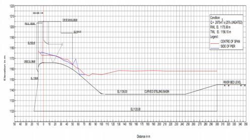 Performanceofspillwaywithstillingbasinwasstudiedfor the entire range of discharges up to the design maximum discharge of 15,800 m3/s gated and ungated operation of spillway.Thetailwaterlevelsat300mdownstreamofdam axisweremaintainedasperthetailwaterratingcurveshown inGraph2.