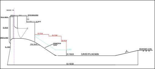 Abstract - A spillway is a crucial component of any dam project. The improper dam design is to blame for the failure of several dams. The planning and construction of the spillway should be done properly. The Himalayan region has recently developed orifice spillways. Since the efficacy of a gated overflow spillway depends on the depth of flow between the FRL and overflow crest elevation, only the widest practical gates are suitable. The incorporation of a breast wall enables orifice spillways, which combine the benefits of deeper flows over the crest with modestly sized gates. The dissipation of kinetic energy generated at the toe of the spillway is essential for bringing the flow velocity of the river back to normal in shortest distance. The energy dissipation arrangement is the most vital part and needs to be done carefully. However hydraulic jump type stilling basin found to be suitable for this project. In the present case an entire design of a spillway suitable to suit the typical site conditions has administered. Spillway has designed for maximum flood discharge of 15,800 m3/s.