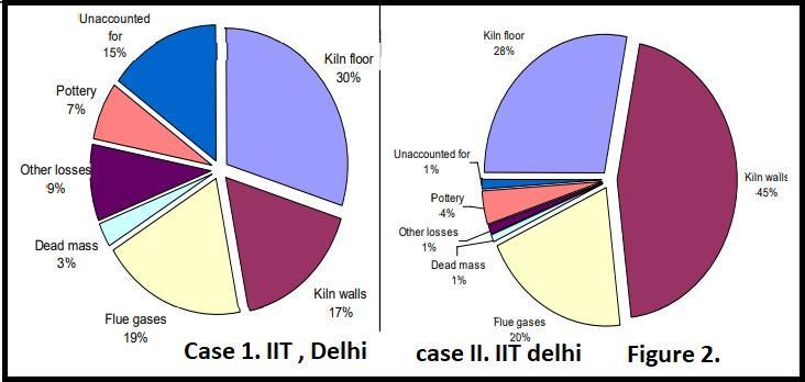 In a Traditional Kiln, The energy released by the combustion of fuel in a pottery kiln gets distributed with only a small fraction getting absorbed by the pottery. In traditional kilns, the walls are made very thick, which absorb a large part of the energy, which is essentially a loss. Also, the fuel is burnt directly on the floor, causing veryhighlossestotheground.Alargepartoftheenergyis lost due to high temperature of the flue gases exiting the kiln. Figure 2 gives the breakup of energy consumed in a traditional updraught kiln used at Kumharpara in Kondagaon,districtBastar,Chhattisgarh.Herehighestloss is to the ground followed by the loss due to the energy stored in the kiln wall, which is 18” thick. Figure 2 gives the energy budget of another updraught kiln used in GramodaySanghatBhadrawati,Maharashtra.Thiskilnhad even thicker walls which stored 45% of the energy released during the operation of the kiln. The losses through the flue gases are nearly the same in both. Other lossesincludetheconvectionandradiationlossesfromthe wallexteriorandtheflames