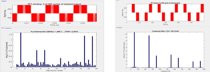 Figure 22: THD of the output Voltage a) SVPWM [[THD = 2.05 percent]] b) Hysteresis controller [THD=25.6percent] SwitchingPulse