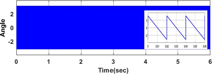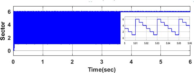 The three phase quantity is converted into two phase quantitybyclarkstransformation.Andfromthetwophase quantity, Vref and angle is obtained . The angle obtained is shown in Figure 8. Figure 8 shows the conversion of angle to sector where angle is converted to 6 sectors. Figure 10 showsthespacevectorPWM.