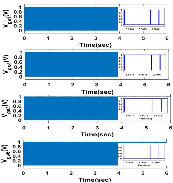 shows the simulink model of Pulse Generation of Switches using Master bit out blocks. The switching pulse ofS1 andS4 (firstleg),S3andS6(ofsecondleg), S5 and S2 (ofthirdleg)isshowninFigure26:(a),(b),(c) respectively. Switch S1, S4 , S3, S6 , S5 andS2 hasafrequencyof3kHz.