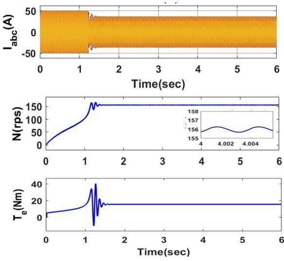 The phase voltages of inverter is shown in Figure 18 which has maximum value of 400V. The motor current, the speed of motor and motor torque at no load are given in Figure 19. It can be seen that we are getting a constant speed of 157 rps and motor torqueis 15 Nm as shown in Figure 19 . Under loadcondition,aloadtorqueof3Nmisapplied.