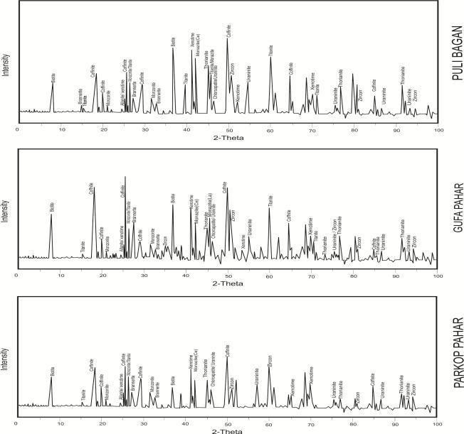 Fig-3:RepresentativeXRDpatternsoftheconstituent mineralphasesrepresentingindividualplutonsa)Puli Baganb)GufaPaharc)ParkopPahar