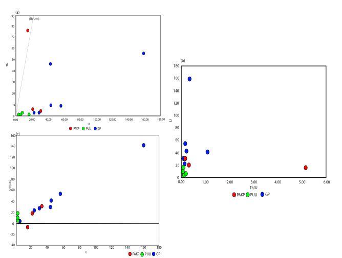 Fig-4:(a)PlottingofNWKarbiHillgranitesontheUversusTh variationplot.(b)TheUversusTh/Uratiovariationplot.(c)The UcontentversusuraniummobilizationequationU-(Th/3.5)plot.