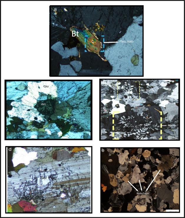 Fig-2: PhotomicrographsofgranitesofNWKarbiHills showinga)PleotropicHaloinBiotiteb)Metamictisationof Allanitec)MyrmekiticTextured)Alterationtexture observeduponplagioclasegrains(sericitisation)e)Alpha tracks